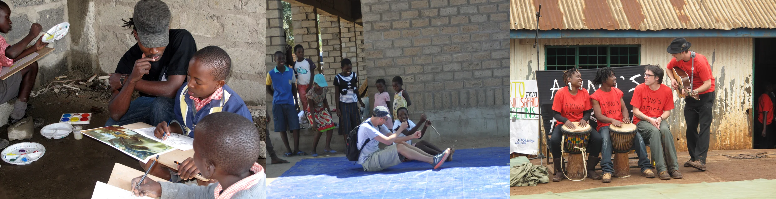 From left to right: Dickson teaches art in mathare; jarek teaches mime in usisya, malawi; and music teachers gareth and billy work with our kenyan trainers lulu and melisa